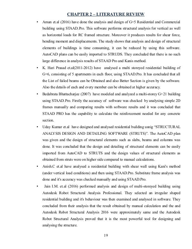 Design & Analysis of G+2 Residential Building Using STAAD Pro from image.slidesharecdn.com A literature review is a scholarly paper that presents the current knowledge including substantive findings as well as theoretical and methodological contributions to a particular topic. A literary review template is a type of written work that discusses published information about a specific subject matter. The literature review chapter of your dissertation or thesis is where you synthesise this prior work and lay the foundation for your own research.